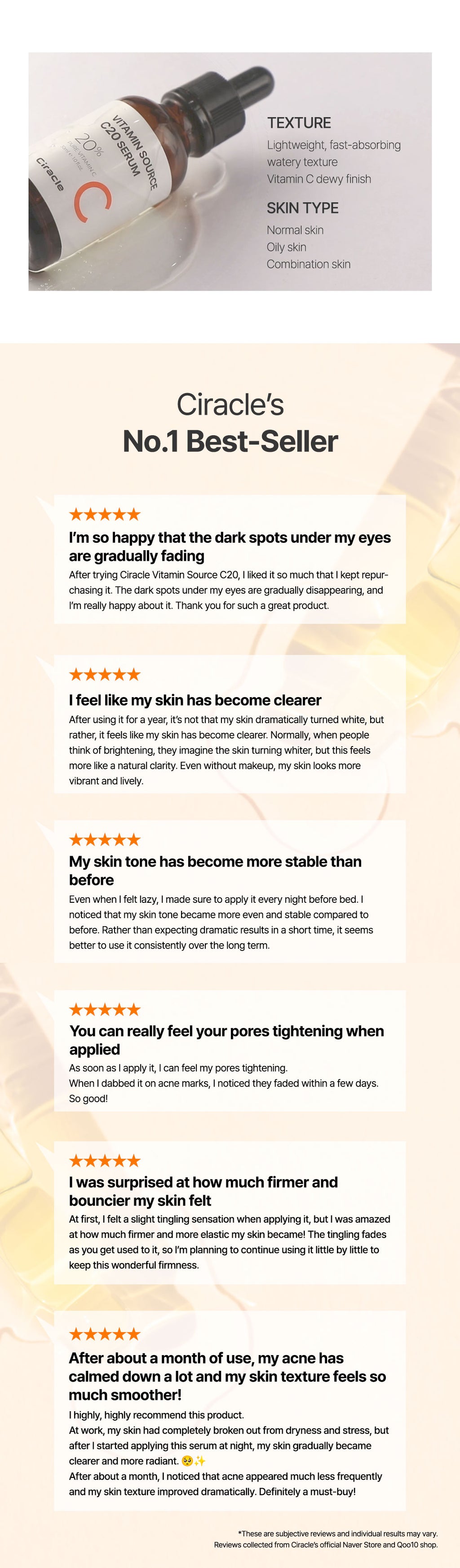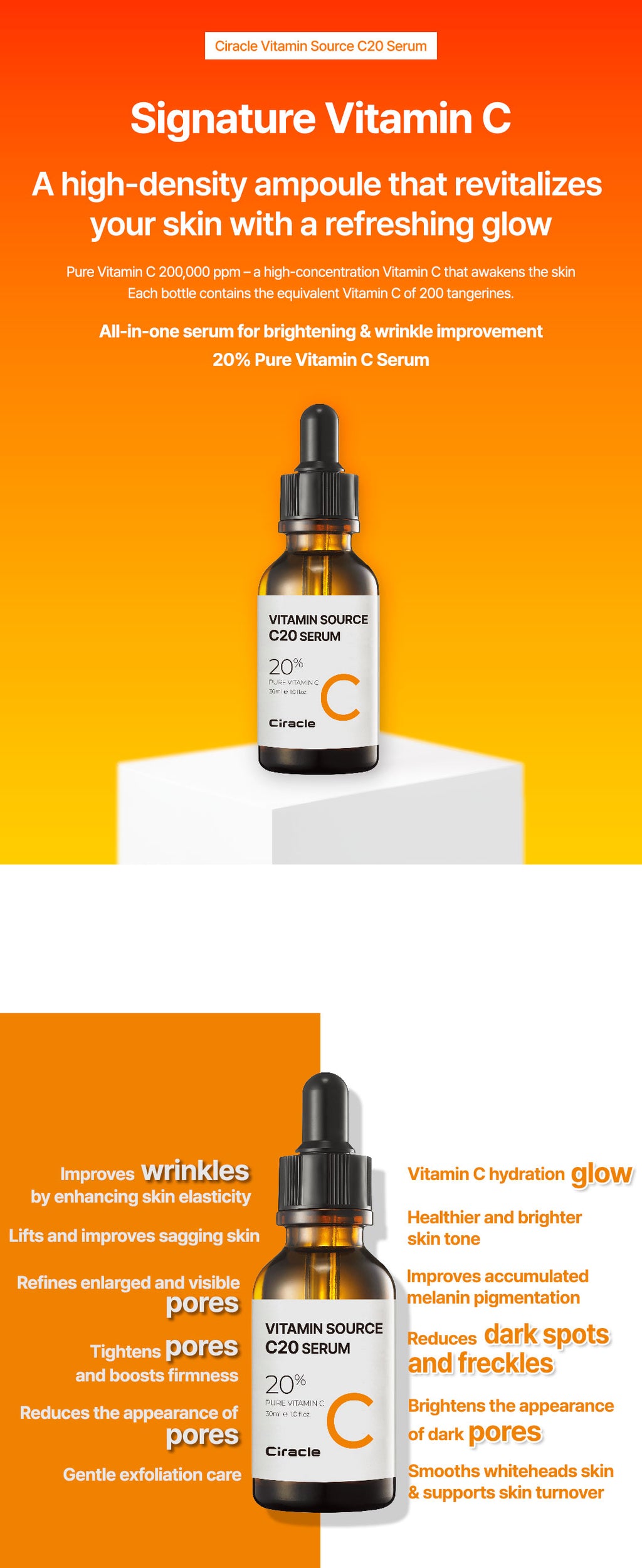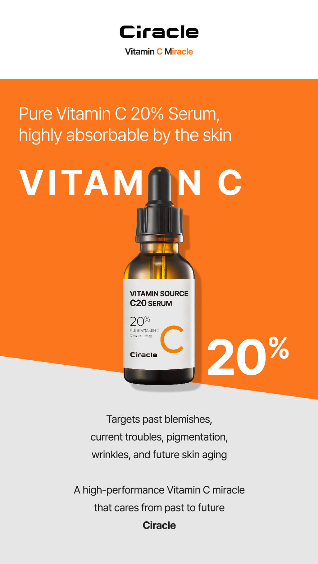 Our ciracle vitamin source C-20, specially formulated with 20 % pure vitamin C and Rosa Davurica Bud Extract, not only improves the appearance of fine lines & wrinkles & boosts glows but also protects skin against oxidation and air pollution.